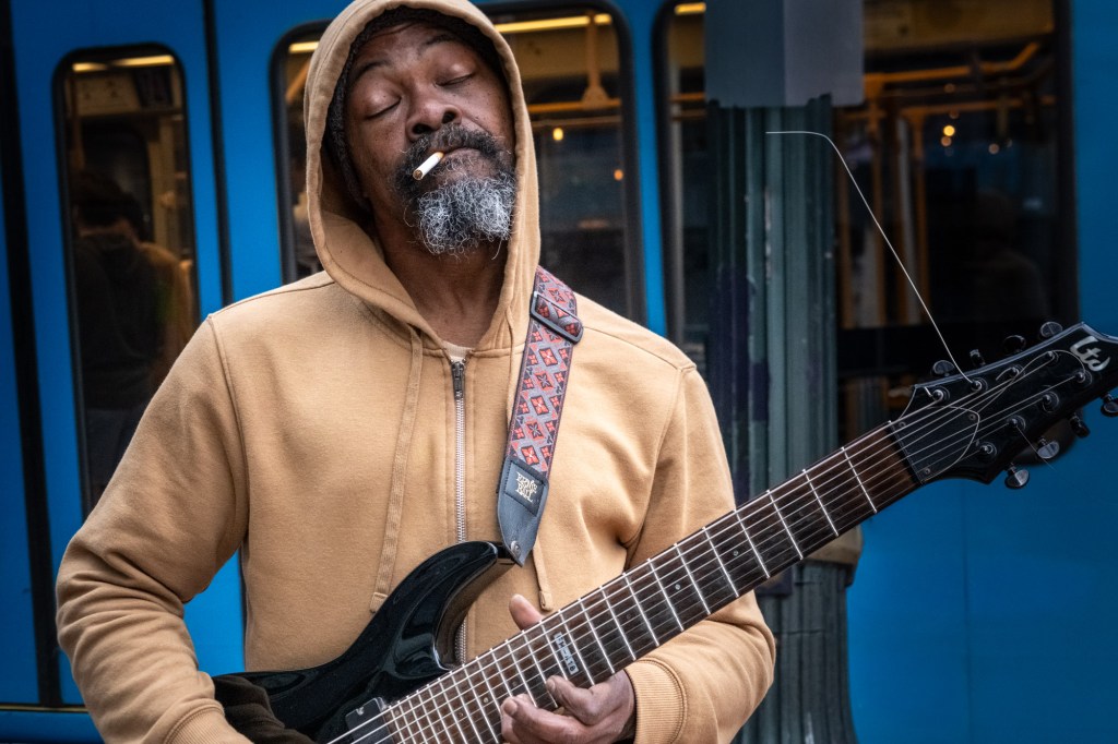 When I parked at the Smart Park at 10th and Yamhill I heard the wildest jangle of cords coming from an electric guitar in the street below. I thought then I would pay them to stop. When I got to street level the sound had changed to a soft sweet melody. Chris was playing his tunes. I subsequently found he had been playing since 7; now 57. He played real good for free. I dropped a buck into the guitar case.